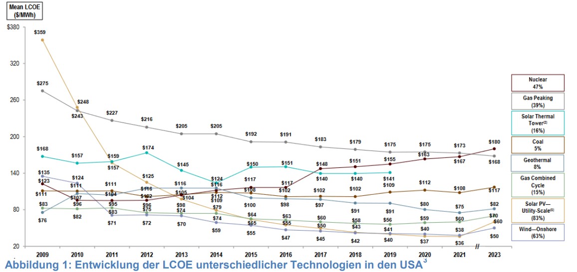 Deshalb hat das Forum Wissenschaft & Umwelt im Auftrag der WUA nun im Rahmen des Projekts „Klimatom. Atomenergie für Klimaschutz?“ zentrale Argumente der Atomlobby überprüft. Das Ergebnis ist bezeichnend. Trotz Milliardeninvestitionen stagniert die Anzahl der aktiven Reaktoren seit Jahrzehnten. Enorme Kapitalkosten und lange Bauzeiten sind primär dafür verantwortlich. Etwa beim finnischen Reaktor Olkiluoto 3, der 16 Jahre für die Fertigstellung benötigte, oder das französische AKW in Flamenville, dass sich seit 2007 Jahren in Bau befindet und immer wieder mit Verzögerungen zu kämpfen hat. Darüber hinaus hat die Entwicklung der letzten Jahrzehnte gezeigt, dass Atomstrom immer teurer wird, während erneuerbare Energien einen Preisverfall verzeichnen (siehe Abbildung). Viele führende Unternehmen im Bereich Energietechnik wenden sich daher zunehmen von der Atomenergie ab und legen ihren Fokus auf erneuerbare Energieträger.